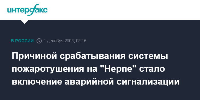 Москва. 1 декабря. INTERFAX.RU - Система пожаротушения ЛОХ на атомной подлодке "Нерпа" сработала из-за включения оповещающей системы, сообщил агентству "Интерфакс - Дальний Восток" сотрудник пресс-службы Амурского судостроительного завода (АСЗ) Марина Радаева, ссылаясь на данные специалистов завода.