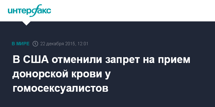 Москва. 22 декабря. INTERFAX.RU - Администрация по контролю за продуктами питания и медикаментами США (Food and Drug Administration, FDA) отменила существовавший в стране на протяжении 30 лет запрет на прием донорской крови у гомосексуалистов и бисексуалов.