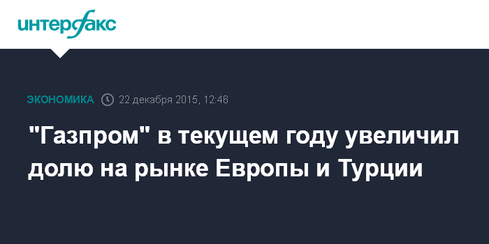 Москва. 22 декабря. INTERFAX.RU – "Газпром" в 2015 году увеличил долю на рынке Европы и Турции на один процентный пункт - с 30,2% до 31,2%, свидетельствуют расчеты "Интерфакса".