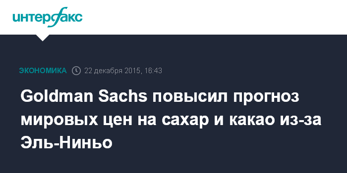 Москва. 22 декабря. INTERFAX.RU – Американский банк Goldman Sachs улучшил прогноз цен на сахар и какао-бобы на фоне неблагоприятных погодных условий, вызванных природным феноменом Эль-Ниньо, сообщает агентство Bloomberg.