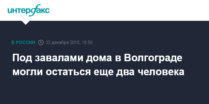 Москва. 22 декабря. INTERFAX.RU - Под завалами девятиэтажного дома по улице Космонавтов в Волгограде, частично разрушенного в результате взрыва газа, могут находиться еще два человека, сообщила во вторник "Интерфаксу" пресс-секретарь управления СКР по Волгоградской области Наталия Куницкая.