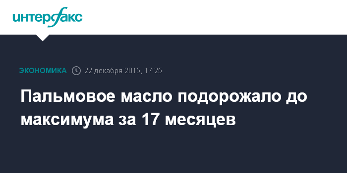 Москва. 22 декабря. INTERFAX.RU – Стоимость пальмового масла во вторник выросла до максимума за 17 месяцев на сообщениях о сокращении производства этого сырья в Малайзии, втором после Индонезии поставщике этого вида масла на мировой рынок, сообщает агентство Bloomberg.