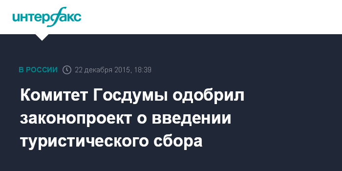 Москва. 22 декабря. INTERFAX.RU - Комитет Госдумы по экономической политике, инновационному развитию и предпринимательству рекомендовал нижней палате парламента принять во втором чтении законопроект, который предусматривает введение туристического сбора с туроператоров.