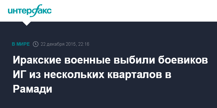 Москва. 22 декабря. INTERFAX.RU - Иракские военные при поддержке сотрудников полиции и суннитских ополченцев сумели выбить террористов ИГ (организация, запрещенная в РФ) из нескольких кварталов в центре города Рамади, сообщило агентство ЭФЭ со ссылкой на источники в силах безопасности Ирака.