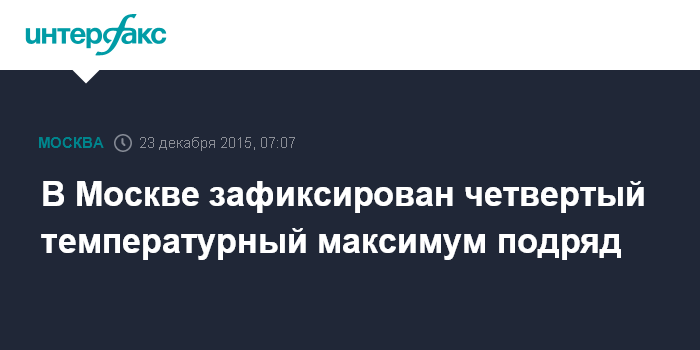 Москва. 23 декабря. INTERFAX.RU - В 6:00 среды температура воздуха в Москве на базовой метеостанции на ВДНХ составила 4,7 градусов, что 0,2 градуса выше прежнего максимума дня, установленного в столице 23 декабря 1982 года, сообщили "Интерфаксу" в Гидрометеобюро Москвы и Московской области.