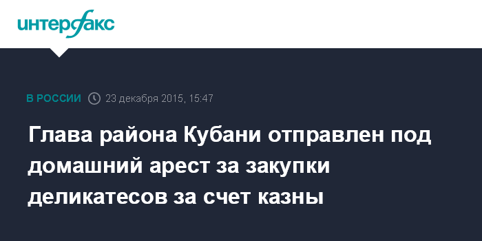 Глава района Кубани отправлен под домашний арест за закупки деликатесов за счет казны