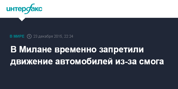 Москва. 23 декабря. INTERFAX.RU - Власти итальянского города Милана временно ввели запрет на движение частного автотранспорта в дневные часы, чтобы бороться с загрязнением воздуха, пишет в среду сайт газеты "Репубблика".