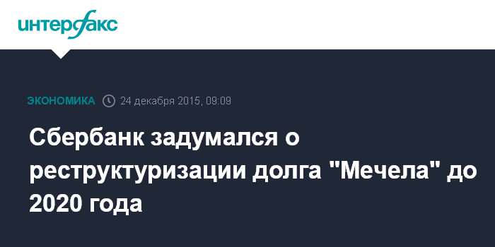 Москва. 24 декабря. INTERFAX.RU - Сбербанк рассматривает возможность переноса выплат части долга "Мечелом" до 2020 года, сообщает в четверг газета "Ведомости" со ссылкой на нескольких источников.