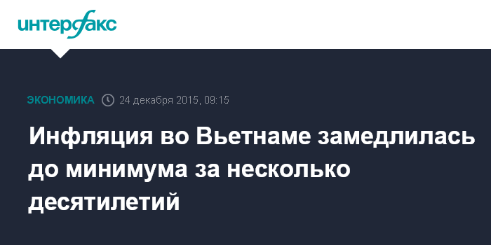 Москва. 24 декабря. INTERFAX.RU - Темпы инфляции во Вьетнаме замедлились до минимума за несколько десятилетий на фоне слабости мировых рынков энергоносителей и сдержанного внутреннего спроса, пишет MarketWatch.