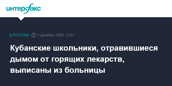 Москва. 1 декабря. INTERFAX.RU - Одиннадцать учеников школы Славянска-на-Кубани (Краснодарский край), которые были госпитализированы на минувшей неделе из-за отравления продуктами горения химических веществ, выписаны из больницы. "Все дети выписаны, у них нет никаких осложнений", - сообщили агентству "Интерфакс-Юг" в Славянском районном управлении Роспотребнадзора.