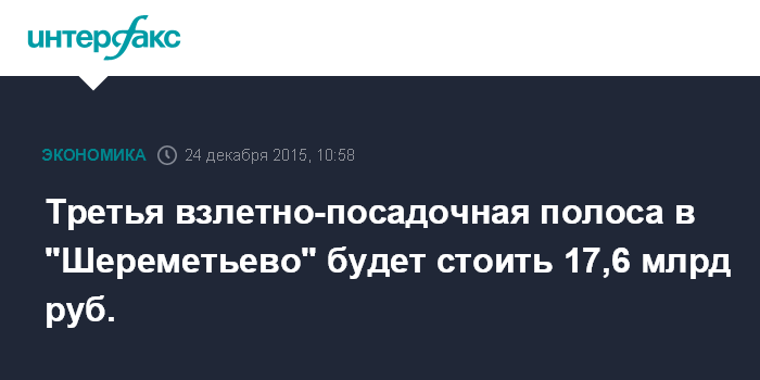 Москва. 24 декабря. INTERFAX.RU – Стоимость контракта на строительство третьей взлетно-посадочной полосы в Шереметьево составляет 17,588 млрд рублей, говорится в материалах сайта госзакупок.