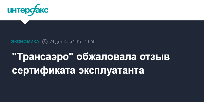 Москва. 24 декабря. INTERFAX.RU - Авиакомпания "Трансаэро" подала иск в Арбитражный суд Москвы о признании недействительным приказа Федерального агентства воздушного транспорта (Росавиация) об аннулировании сертификата эксплуатанта, следует из материалов картотеки арбитражных дел.