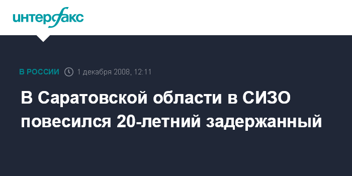 Москва. 1 декабря. INTERFAX.RU - В камере для задержанных Пугачевского ОВД Саратовской области в минувшую субботу покончил жизнь самоубийством 20-летний молодой человек.