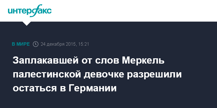 Москва. 24 декабря. INTERFAX.RU - 14-летняя беженка из Палестины по имени Реем Сахвиль, которая расплакалась на встрече с канцлером Германии Ангелой Меркель, получила разрешение на проживание в этой стране до 17 октября 2017 года, пишет в четверг немецкая газета Bild.