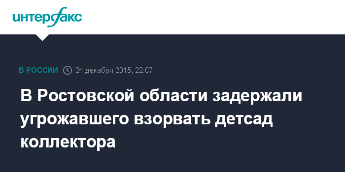 Москва. 24 декабря. INTERFAX.RU - Задержанный мужчина, угрожавший взрывом детского сада в городе Сальск из- за долга микрофинансовой организации, обвинён в вымогательстве.