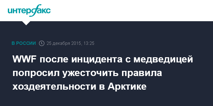 Москва. 25 декабря. INTERFAX.RU - Всемирный фонд дикой природы призвал министерство природы и министерство обороны России ужесточить правила безопасности при хозяйственной деятельности в Арктике после инцидента с белой медведицей на острове Врангеля.