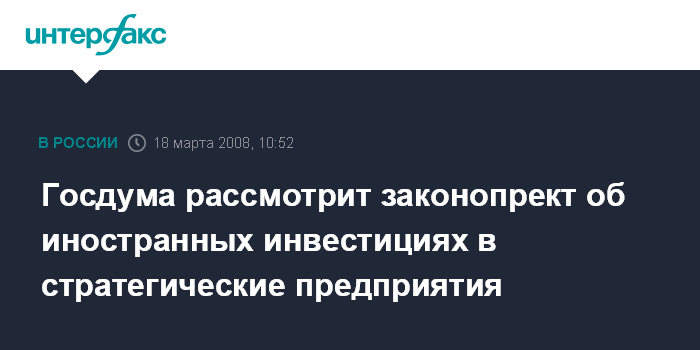 Госдума рассмотрит законопрект об иностранных инвестициях в стратегические предприятия