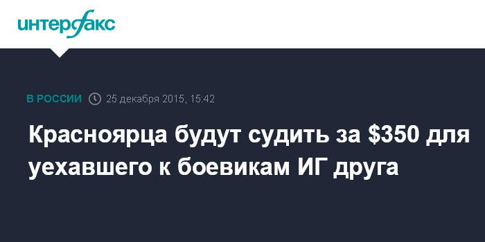 Москва. 25 декабря. INTERFAX.RU - Московский окружной военный суд рассмотрит дело жителя Красноярска, обвиняемого в содействии террористической деятельности за то, что он дал деньги своему другу, который собирался в Сирию воевать на стороне запрещенного в РФ "Исламского государства", сообщает пресс-служба прокуратуры Красноярского края.