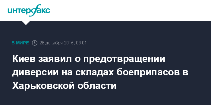 Москва. 26 декабря. INTERFAX.RU - Попытка диверсии на складах хранения боеприпасов в Харьковской области Украины пресечена в ночь на субботу, сообщает украинское министерство обороны.