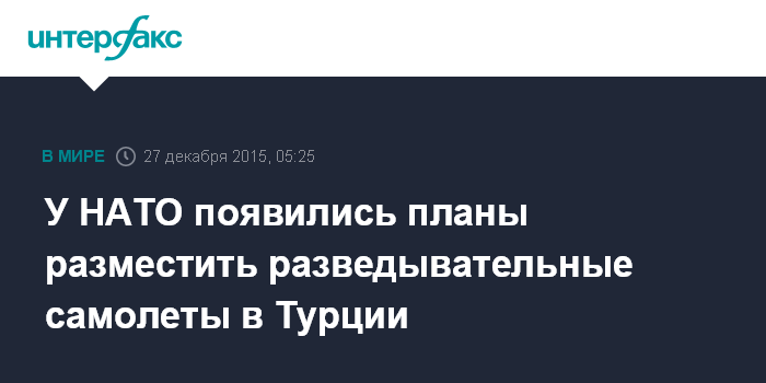 Москва. 27 декабря. INTERFAX.RU - НАТО для усиления ПВО Турции приняла решение временно перебросить на турецкую авиабазу самолеты дальнего радиолокационного обнаружения Boeing E-3, сообщили германские СМИ.