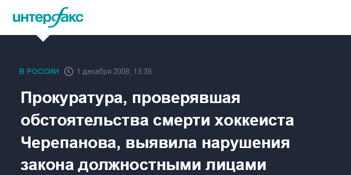 Москва. 1 декабря. ИНТЕРФАКС - Прокуратура выявила нарушения закона в ходе проверки по факту смерти хоккеиста Алексея Черепанова, скончавшегося в октябре этого года во время хоккейного матча в подмосковном Чехове.