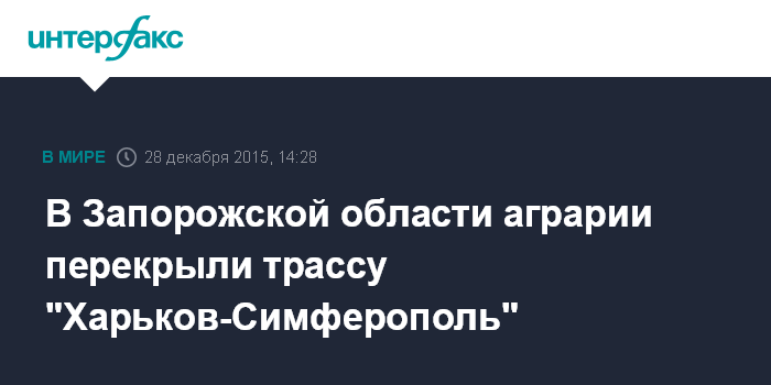 Москва. 28 декабря. INTERFAX.RU - Несколько сотен фермеров Запорожской области перекрыли трассу государственного значения "Харьков-Симферополь" в знак протеста против изменений в Налоговом кодексе Украины, повышающих налог для аграриев в 1,8 раза и снимающих специальный режим обложения НДС.