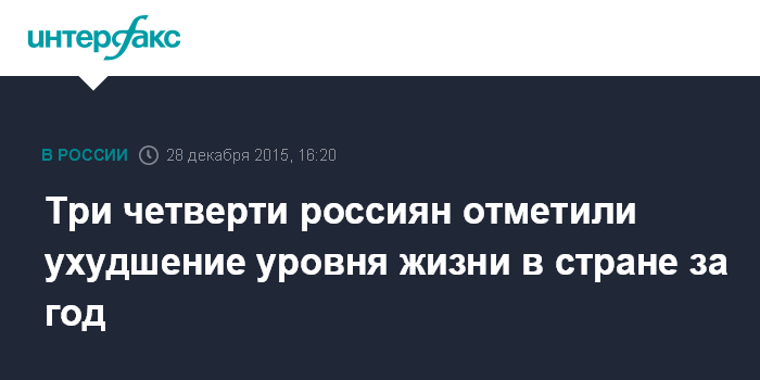 Москва. 28 декабря. INTERFAX.RU - Большинство россиян считают, что уходящий год оказался труднее, чем предыдущий, и в целом для страны (60%), и лично для них самих (55%), а 75% полагают, что уровень жизни большинства населения России изменился к худшему, сообщили "Интерфаксу" в "Левада-Центре".