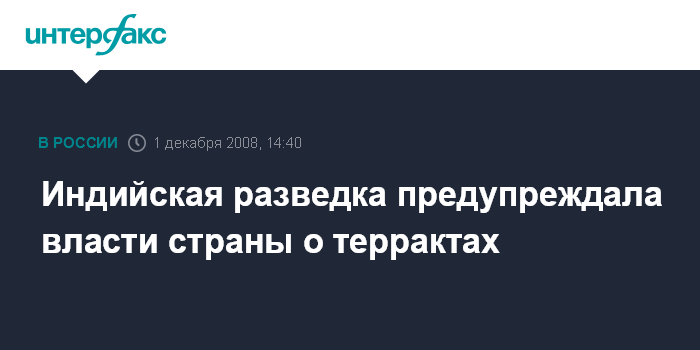 Москва. 1 декабря. INTERFAX.Ru - Власти Индии несколько месяцев назад получили предупреждение от служб разведки о возможных террористических атаках, похожих на те, что произошли в Мумбаи на минувшей неделе, утверждает в понедельник межарабская телекомпания "Аль-Джазира".