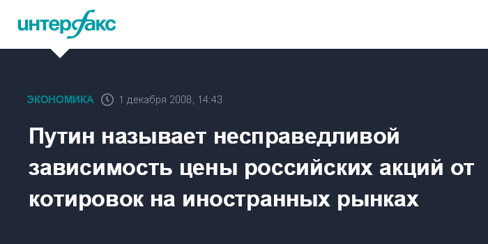 Москва. 1 декабря. INTERFAX.RU - Премьер-министр РФ Владимир Путин называет несправедливой сложившуюся систему, при которой цена российских акций чрезмерно зависит от котировок на зарубежных рынках.