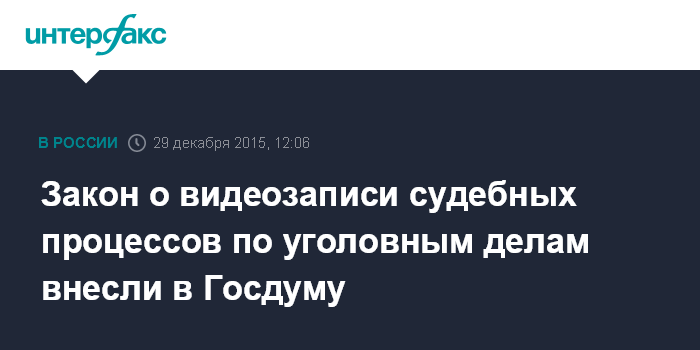 Москва. 29 декабря. INTERFAX.RU - Правительство РФ внесло на рассмотрение Госдумы законопроект, предусматривающий обязательную видеозапись уголовных процессов в российских судах, сообщает официальный сайт нижней палаты парламента.