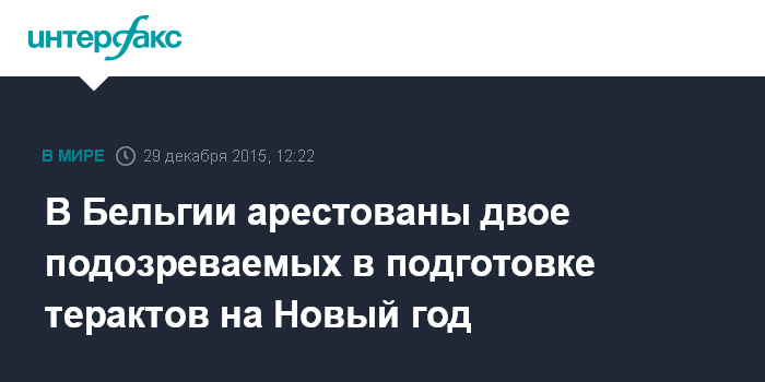 Москва. 29 декабря. INTERFAX.RU - Два человека арестованы в Бельгии по подозрению в подготовке вооруженных нападений в Брюсселе во время новогодних каникул, передает во вторник агентство Associated Press.