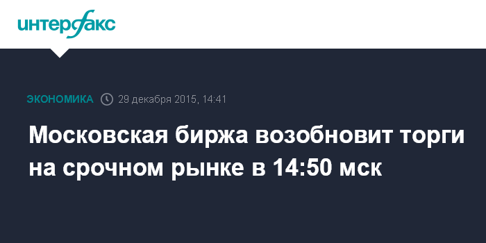 Москва. 29 декабря. INTERFAX.RU – Московская биржа возобновит торги на срочном рынке после промежуточного клиринга в 14:50 мск, говорится в сообщении биржи. Торговая система доступна для снятия ранее выставленных заявок.