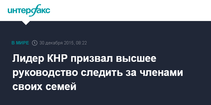 Москва. 30 декабря. INTERFAX.RU - Китайские руководители высшего звена должны обращать внимание на поведение членов своих семей, воспитывать их и следить за тем, что они делают, заявил председатель КНР Си Цзиньпин.
