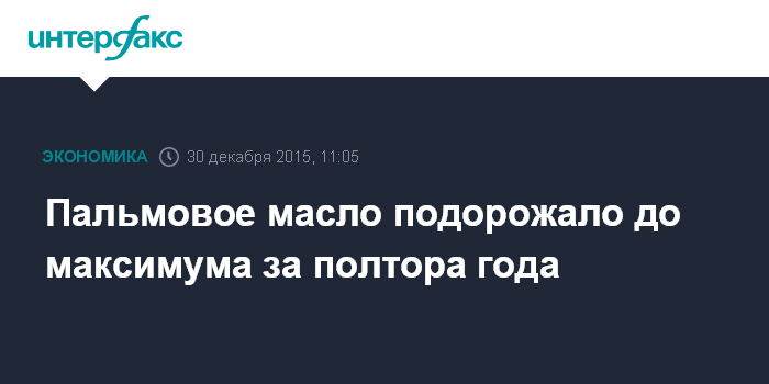 Москва. 30 декабря. INTERFAX.RU – Цена пальмового масла в среду продолжает подниматься на опасениях сокращения производства этого сырья в Малайзии, втором после Индонезии поставщике этого вида масла на мировой рынок, сообщает агентство Bloomberg.