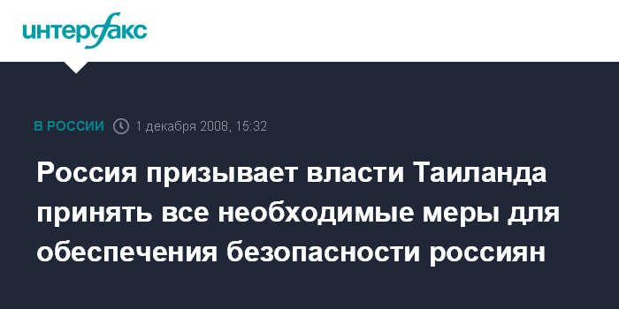 Москва. 1 декабря. INTERFAX.RU - Россия призывает власти Таиланда обеспечить безопасность граждан РФ, оказавшихся в этой стране, сообщает МИД РФ. Как говорится в сообщении российского внешнеполитического ведомства, распространенном в понедельник, 1 декабря в МИД РФ был приглашен посол Таиланда в Москве Сулпот Тиракаосан.