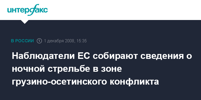 Москва. 1 декабря. INTERFAX.RU - Наблюдатели Евросоюза в понедельник прибыли в грузинские села Квеши, Кошка и Мерети для сбора свидетельств о произошедшей минувшей ночью перестрелке на административной границе между Грузией и Южной Осетией.