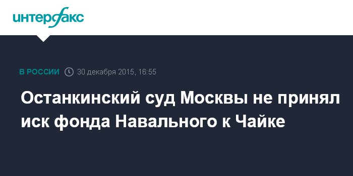Москва. 30 декабря. INTERFAX.RU - Останкинский суд Москвы отказался принять иски Фонда борьбы с коррупцией (ФБК) Алексея Навального к генпрокурору Юрию Чайке и средствам массовой информации.