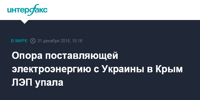Москва. 31 декабря. INTERFAX.RU - Электроопора линии электропередачи "Каховка-Титан", поставляющей электроэнергию с Украины в Крым, рухнула, сообщил пресс-секретарь компании "Укрэнерго" Зиновий Буцьо.