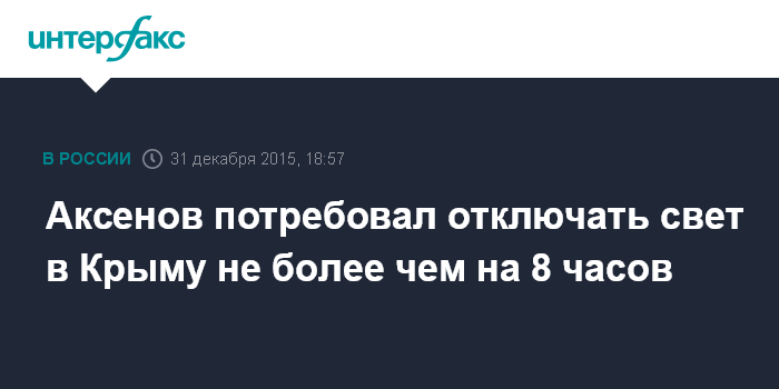 Москва. 31 декабря. INTERFAX.RU - Отключения электричества в регионах Крыма не должны превышать восьми часов в сутки, заявил глава республики Сергей Аксенов в четверг вечером на заседании штаба по ликвидации ЧС на полуострове.