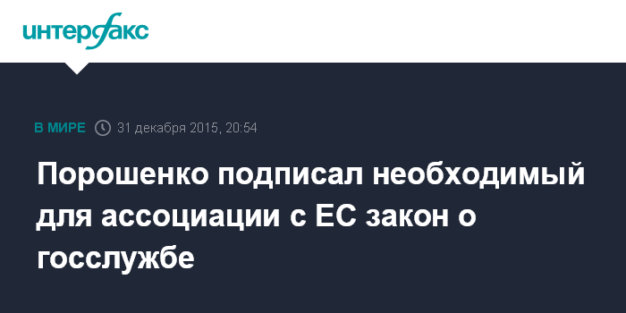 Москва. 31 декабря. INTERFAX.RU - Президент Украины Петр Порошенко подписал закон "О государственной службе", которые дает старт реформе системы государственного управления, сообщила пресс-служба главы государства.