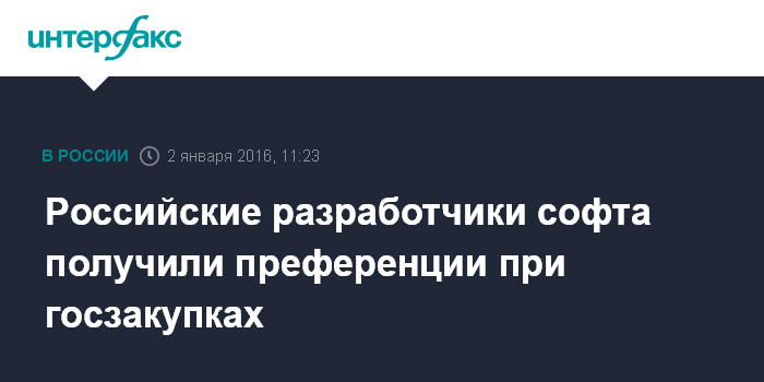 Москва. 2 января. INTERFAX.RU - Вступили в силу закон и постановление правительства РФ о предоставлении преференций российским разработчикам программного обеспечения при госзакупках.