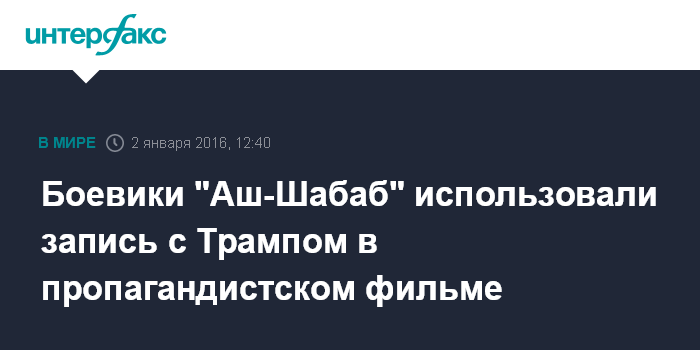 Москва. 2 января. INTERFAX.RU - Боевики радикальной сомалийской группировки "Аш-Шабаб" использовали в своем пропагандистском ролике видеозапись с американским миллиардером Дональдом Трампом, призывающим запретить мусульманам въезд в США, сообщает в субботу британская The Guardian.