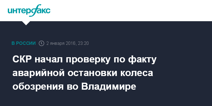 Москва. 2 января. INTERFAX.RU - Следственные органы СКР по Владимирской области начали доследственную проверку по факту аварийной остановки колеса обозрения "Небо-33" в центральном городском парке Владимира, сообщила пресс-служба СУ СКР по региону.