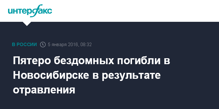 Москва. 5 января. INTERFAX.RU - Пять человек без определенного места жительства погибли в Новосибирске после употребления неизвестной жидкости, еще один бездомный доставлен в тяжелом состоянии в больницу, сообщает пресс-служба ГУ МВД России по региону.