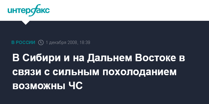 Москва. 1 декабря. INTERFAX.RU - МЧС России предупреждает жителей Сибирского и Дальневосточного федеральных округов о возможности возникновения чрезвычайных ситуаций в связи с сильными заморозками.