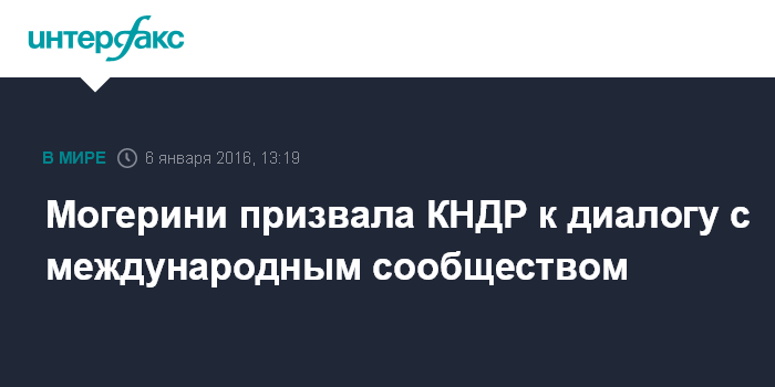 Могерини призвала КНДР "вновь участвовать в эффективном и содержательном диалоге с международным сообществом, в частности, в рамках шестисторонних переговоров и прекратить это незаконное и опасное поведение".