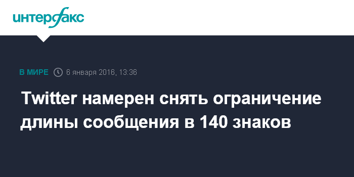 Москва. 6 января. INTERFAX.RU - Сервис микроблогов Twitter может снять ограничение длины сообщений в 140 знаков, сообщает интернет-издание Re/code.