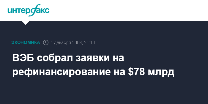 Москва. 1 декабря. INTERFAX.RU - Внешэкономбанк (ВЭБ) собрал заявки на рефинансирование внешних займов на $78 млрд, из которых на $28 млрд - от банков и на $50 млрд - от компаний, сообщил председатель ВЭБа Владимир Дмитриев на брифинге в понедельник.