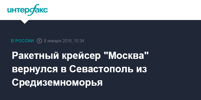 Москва. 9 января. INTERFAX.RU - Ракетный крейсер "Москва", выполнявший задачу прикрытия авиабазы Хмеймим в Сирии, вернулся в Севастополь из Средиземного моря, сообщил "Интерфаксу" в субботу официальный представитель Черноморского флота капитан 1 ранга Вячеслав Трухачев.