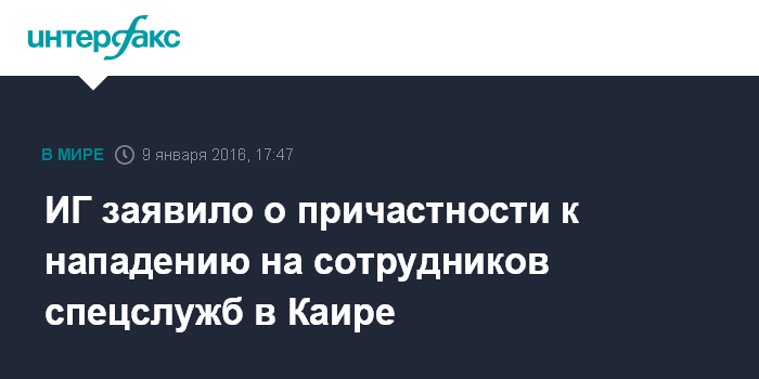 Москва. 9 января. INTERFAX.RU - Террористическая группировка "Исламское государство" (запрещенная в России) взяла на себя ответственность за нападение на сотрудников египетской службы безопасности в Каире в субботу, сообщает межарабский телеканал "Аль-Арабия"